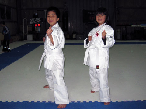 小学2年のK大、小学3年のM美は稽古前に拳法衣に着替える。