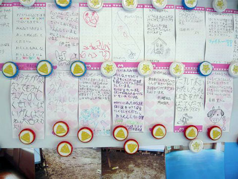 それは、今回の震災のことを忘れないため、また、皆さんからの励ましや義援金で練習が出来るようになったことを、忘れないようにしようという意味で貼り付けています。
