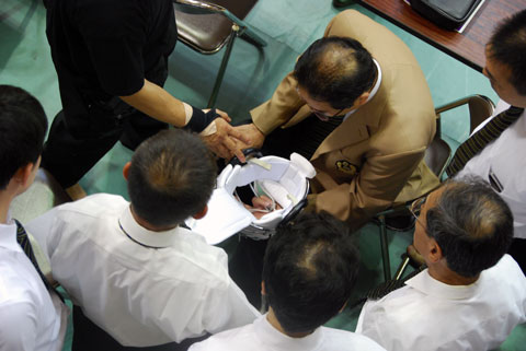試合終了後、審判団で徳大式防具面を検証しました。