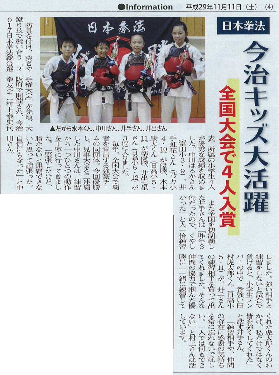 防具を付け、突きや蹴り技で競い合う「2017日本拳法総合選手権大会」が先頃、大阪府で開催され、今治拳友会(村上泰史代表)所属の小学生4人が優秀な成績を収めました。中川はるかさん(富田小3・9)、井手虹花さん(乃万小4・10)が優勝、水本康太くん(日高小5・11)が準優勝、井出七星さん(日高小6・12)が3位に入りました。
