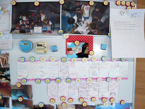 それは、今回の震災のことを忘れないため、また、皆さんからの励ましや義援金で練習が出来るようになったことを、忘れないようにしようという意味で貼り付けています。