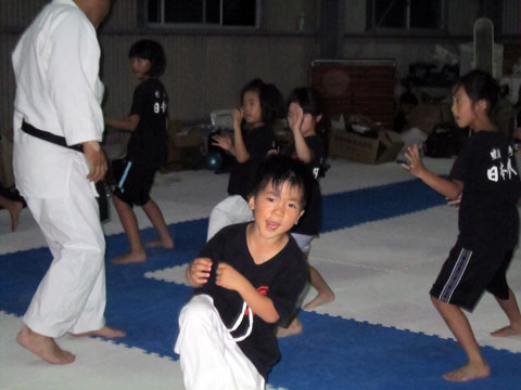 幼稚園組のコタロー指導員はカメラ目線で、元気な気合いで「えい!」