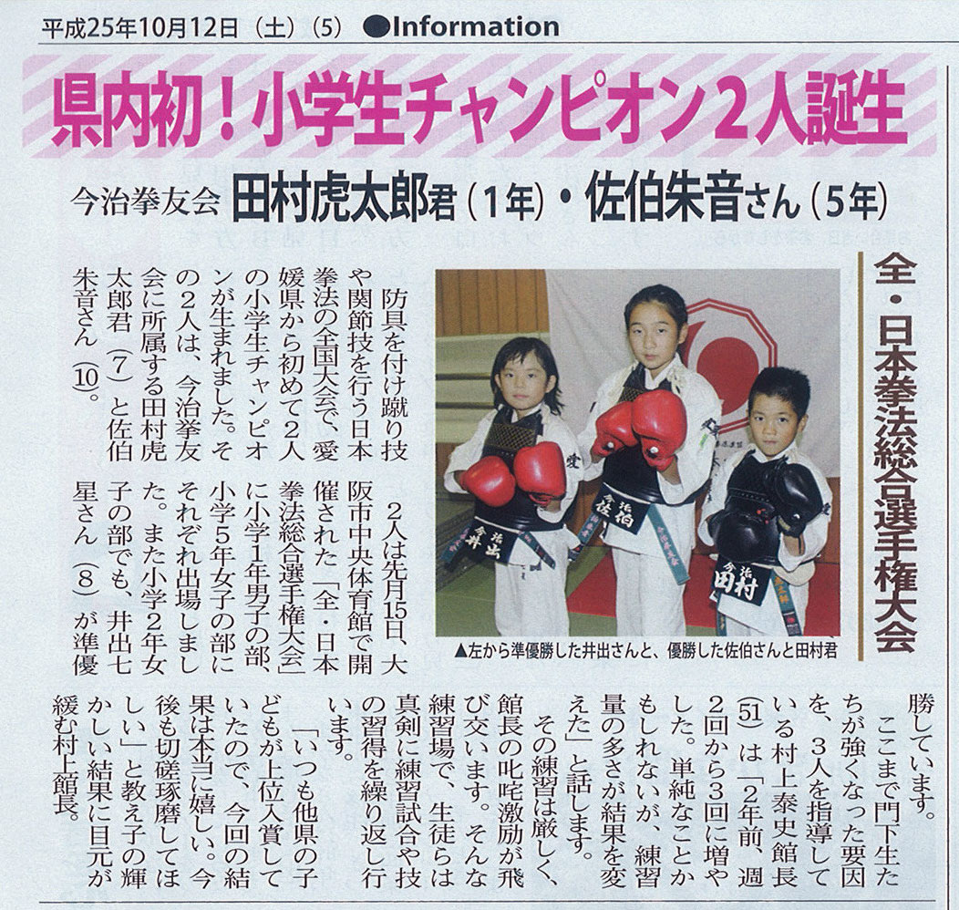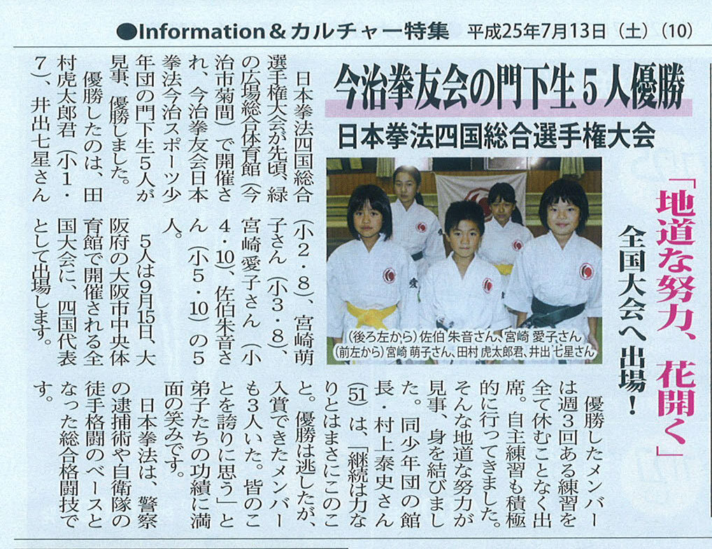 平成25年10月12日(土)付 MY TOWN まいたうん No.622に、今治拳友会の記事が掲載されました。