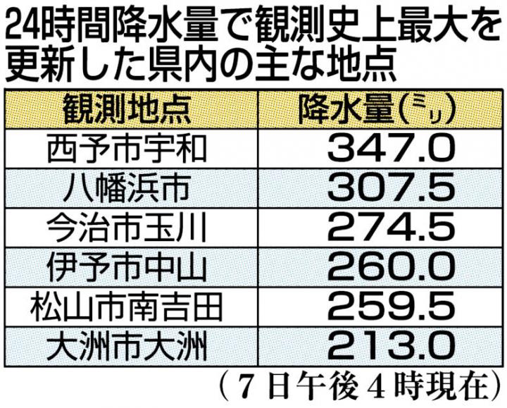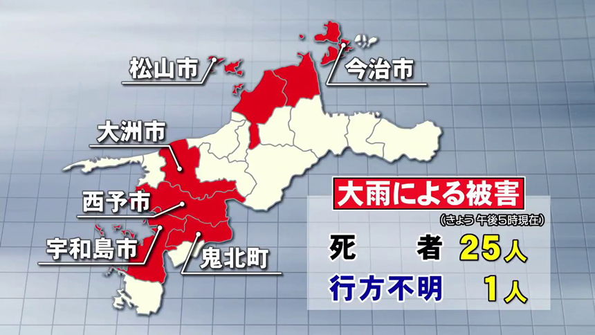 また、土砂崩れや河川の氾濫で被害が甚大な宇和島市と大洲市、西予市、今治市、松野町、鬼北町の6市町に災害救助法が適用されました。