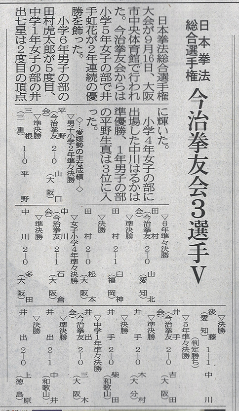 日本拳法総合選手権大会が9月16日、大阪市中央体育館で行われた。今治拳友会からは小学5年女子の部では井手虹花が2年連続の優勝を飾った。