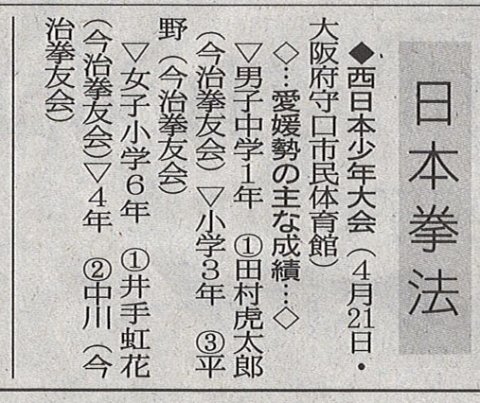 平素は愛媛県日本拳法連盟の活動に対しご理解とご高配を賜り厚く御礼申し上げます。当連盟主管により先般5月5日に開催いたしました第12回日本拳法四国総合選手権大会は、県内外からの多数の選手の参加を得て、関係各位の皆様の多大なるご理解、温かいご支援とご協力のもと、無事に大会を終了することが出来ました。我々大会関係者にとりましても、出場した選手にとっても、大変意義有る大会となりました。皆様方の温かいご支援とご協力に厚くお礼申し上げます。