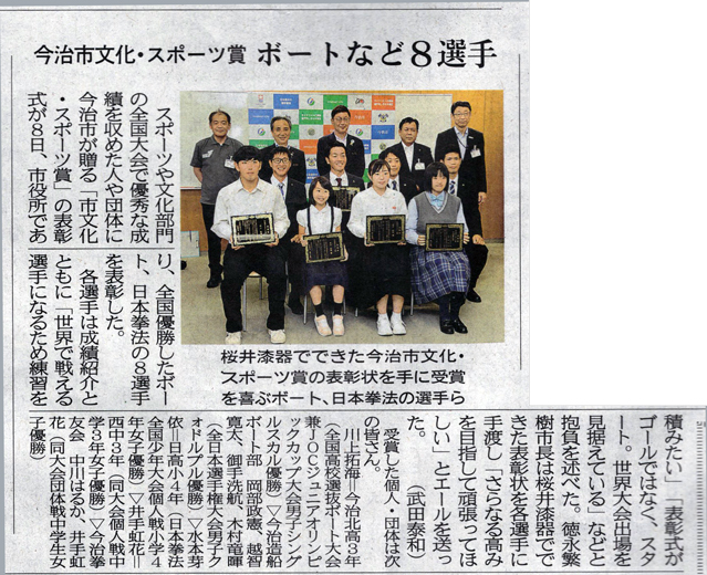 スポーツや文化部門の全国大会で優秀な成績を収めた人や団体に今治市が贈る「市文化・スポーツ賞」の表彰式が8日、市役所であり、全国優勝したボート、日本拳法の8選手を表彰した。