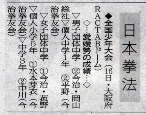 愛媛新聞「Sportえひめ」日本拳法東日本少年形・防具選手権兼第二回東日本道場生交流大会