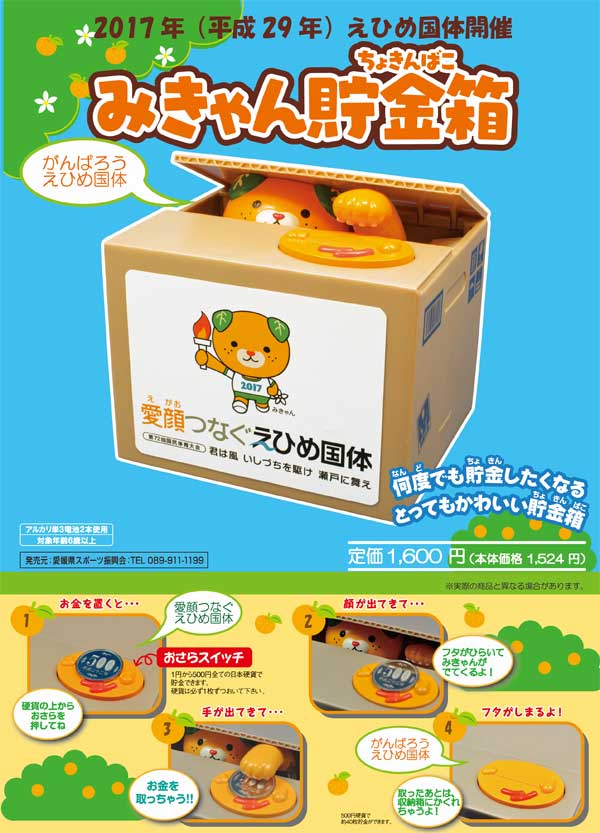 このような状況に鑑み、東京オリンピック開催を契機に創設された本県スポーツの振興を支援する愛媛県スポーツ振興会では、えひめ国体マスコツトキャラクターの「みきゃん」をデザインした貯金箱を製作して、えひめ国体開催を広く県民に周知し、開催機運の醸成を図るとともに、売上収益金を各競技団体の競技力向上支援に充てることにしました。
