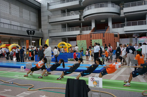 えひめ国体の公開競技の綱引、愛媛県綱引連盟による綱引体験。