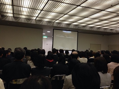 式開始40分前にもかかわらず、本会場には入れず家族会場で、スクリーン映像で入学式。