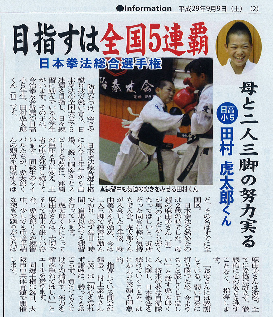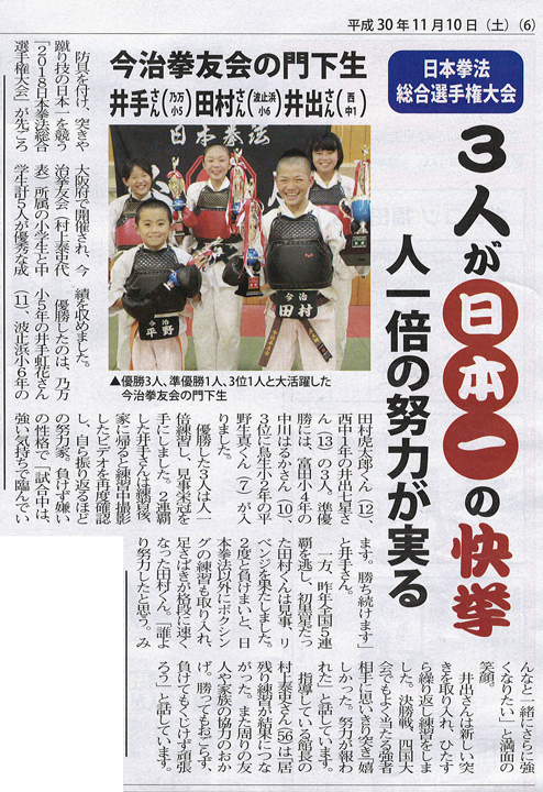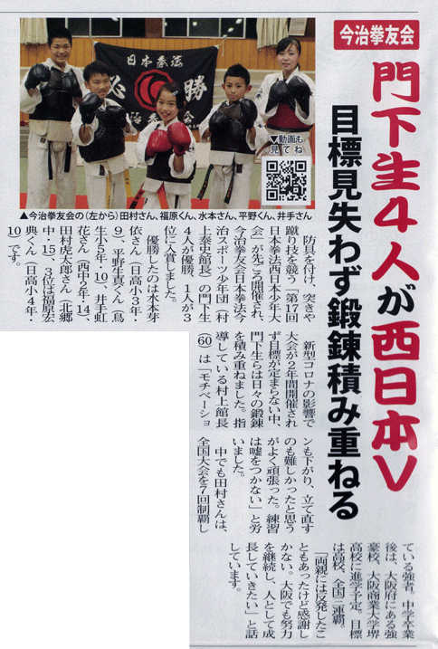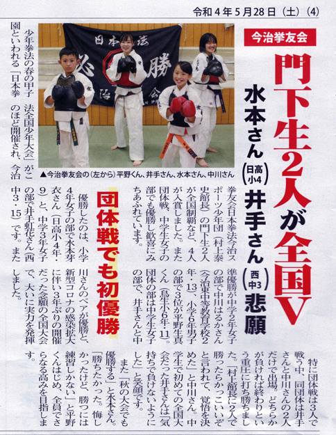 少年拳法の春の甲子園といわれる「日本拳法全国少年大会」がこのほど開催され、今治拳友会日本拳法今治スポーツ少年団(村上泰史館長)の門下生2人が全国制覇など、4人が入賞しました。また団体戦、中学生女子の部でも優勝し歓喜にみちあふれています。