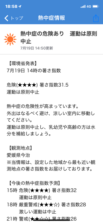 ツイート7月19日(木)愛媛県今治の天気は快晴、最高気温は34度、車外温度計は37度を指しています。