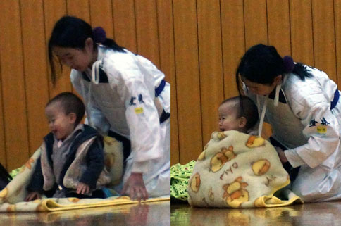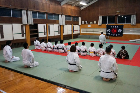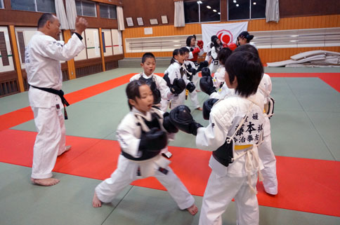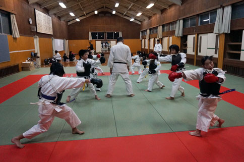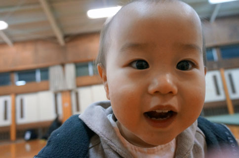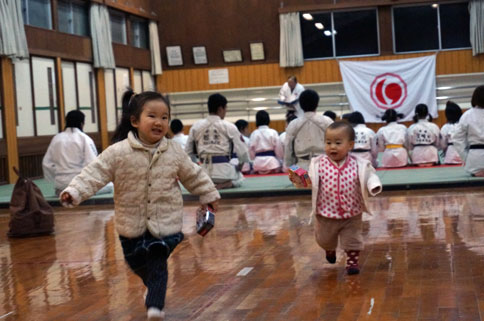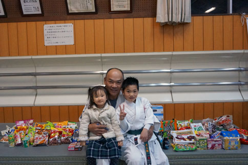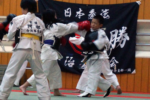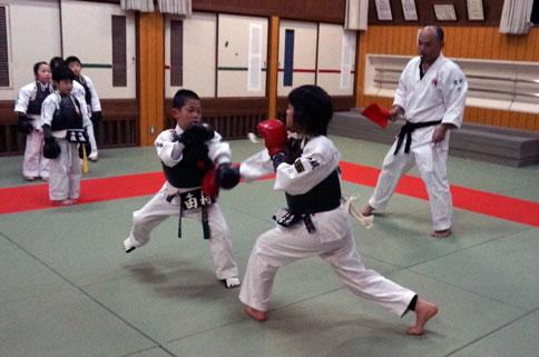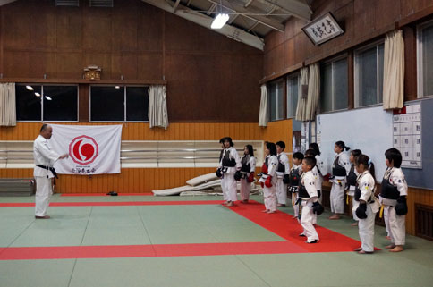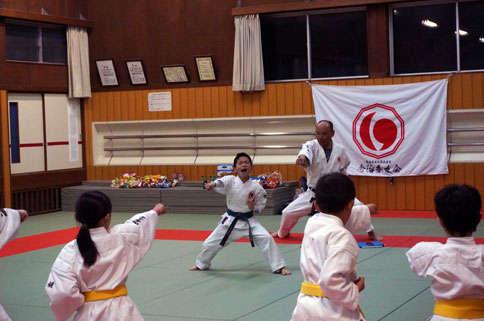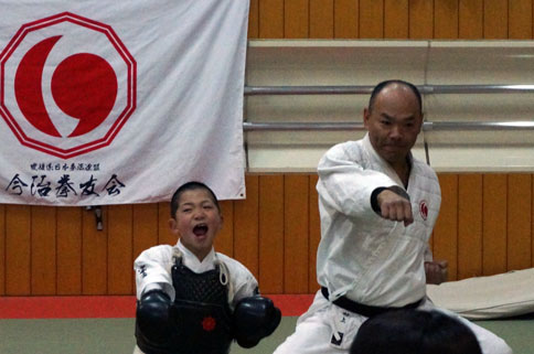 少年部稽古の締めは、「一人で五人分の気合い!」がモットーの小学校一年生のコタロー指導員の気合いの十本突き。