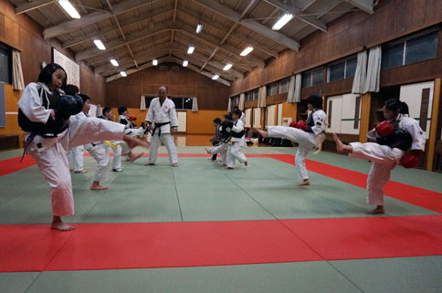 両手で抱え込んで、相手のお腹に突き刺さるように蹴るべし!