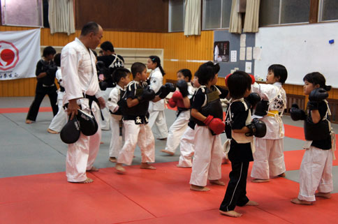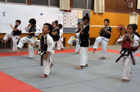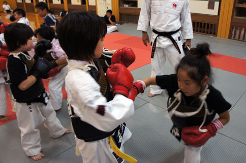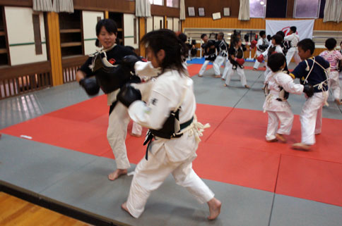 向かって左側より今治拳友会のAKB48こと、小学校三年生ののん、りん、