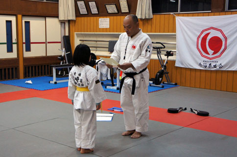 少年部稽古終了後、小学校二年生のもえこに級認定書の授与。
