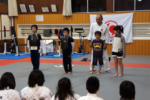 今日が生まれて初めての日本拳法体験の幼稚園組の男の子に、