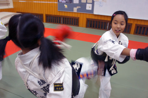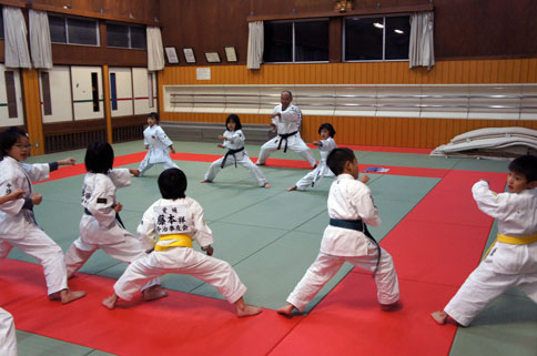 少年部稽古の締めは、道場一番乗りの小学校二年生の三人組の気合いの十本突き。