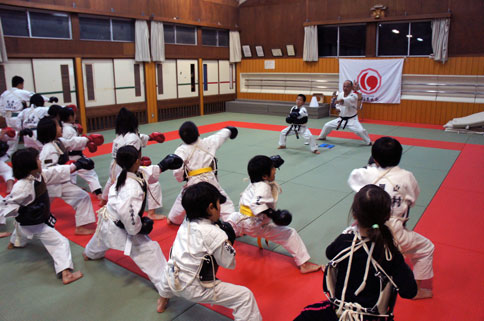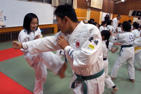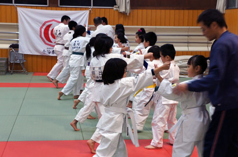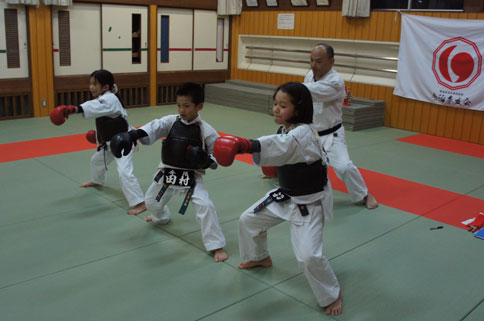 稽古の締めは、「一人で五人分の気合い!」がモットーの小学校一年生のコタロー指導員の号令で、気合いの十本突き。