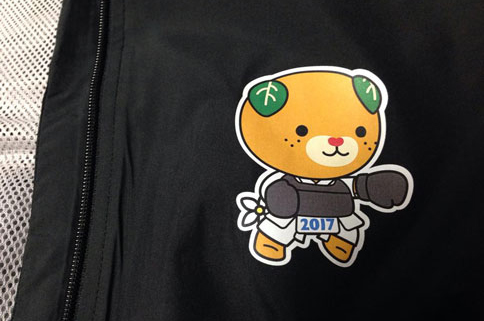胸には、えひめ国体マスコット「みきゃん」Ver.日本拳法