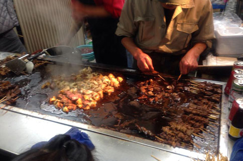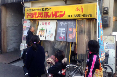 大正区名物、沖縄風ホルモン。立ち食い屋台。