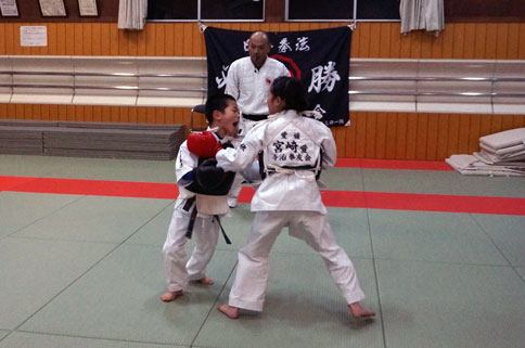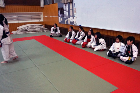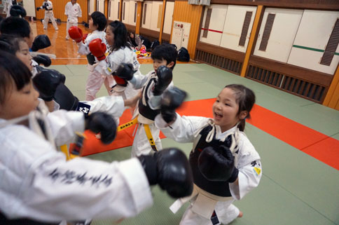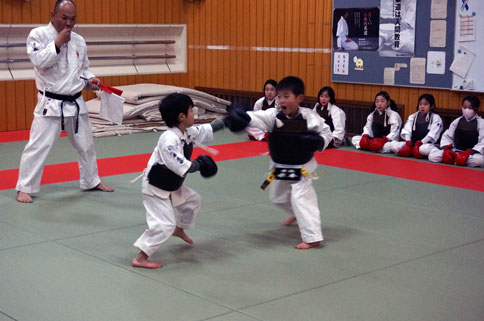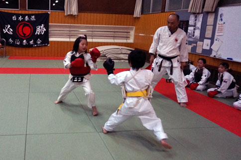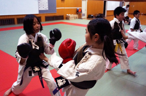 今治拳友会の少年部主将のあーちゃんことあかねと岩国道場のこゆきのマドンナ対決。