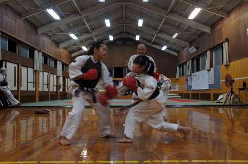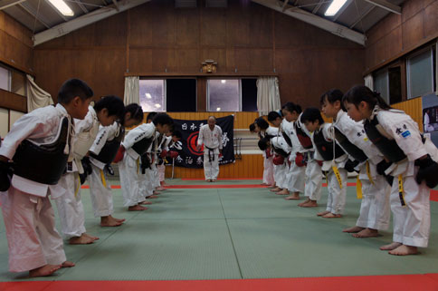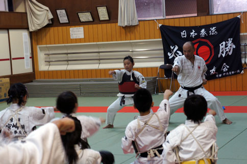 少年部稽古の締めは、小学校三年生のななせの号令で気合いの十本突き。