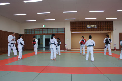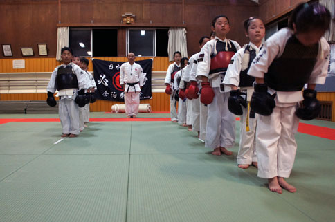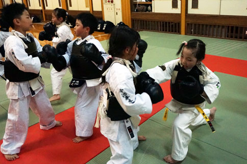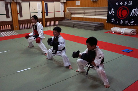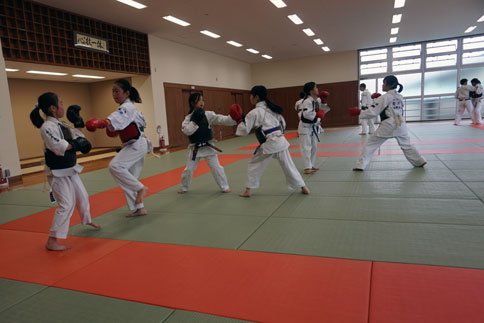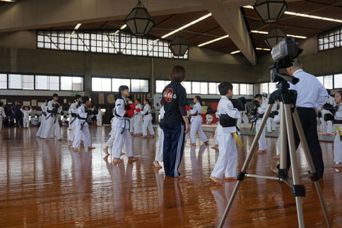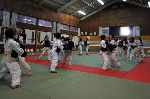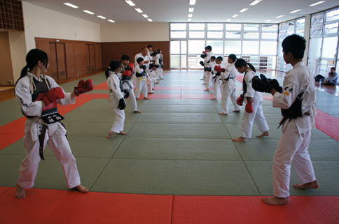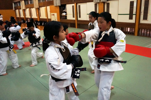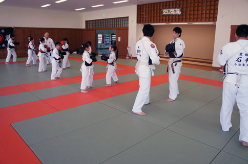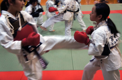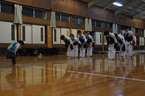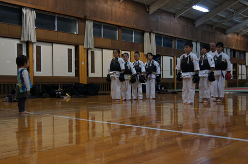 会場に到着したら、拳法衣に着替えて、ウォームアップ、防具練習。