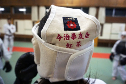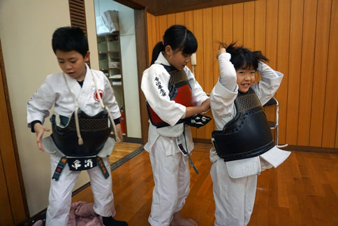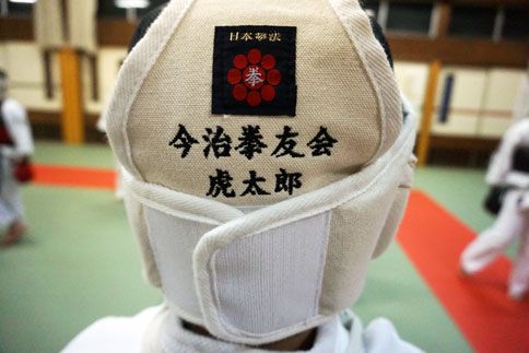 自分でしっかり防具をつけるのが、今治拳友会のルール。