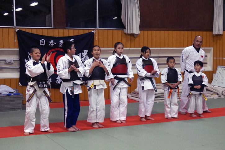 少年部稽古終了後、白虎会大会の結果報告並びに今後の抱負の発表タイム。