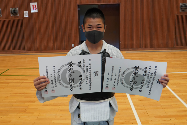 実撃ルールで、はじめての大会、中学三年生の田村虎太郎。一般男子段外の部もチャレンジしました。