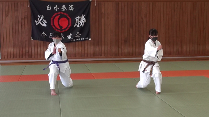形の基本は、左構え(左手、左足前)ですが、右構え(右手、右足前)も可としています。