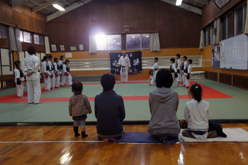 少年部稽古の締めは、徳島大会で優勝したそら、もえこ、コタロー、あいりの号令で気合いの十本突き。