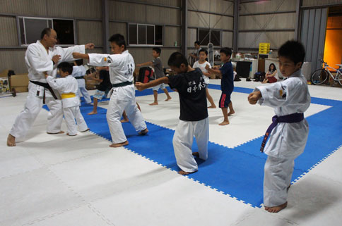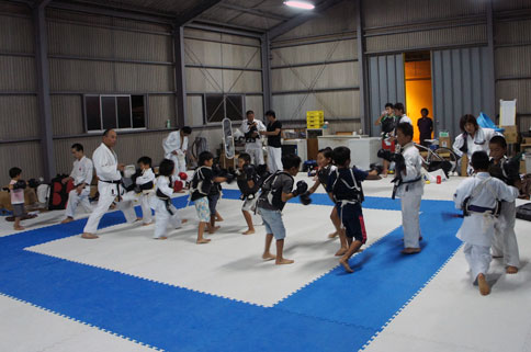 18時には、今治拳友会道場横にバスを横付け。