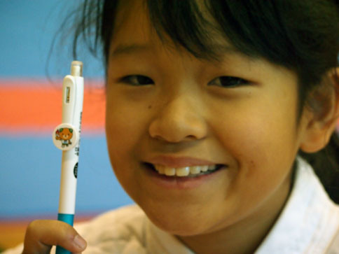 愛媛県から、みきゃんグッズのシャーペンを頂き、高校生以下の参加者の皆さんに、お配りさせて頂きました。グッズを貰って嬉しそうな小学校三年生の愛子。