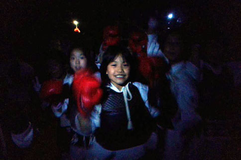 真っ黒な道場内を走り回り、小さな灯りに群がる子ども達。(笑)