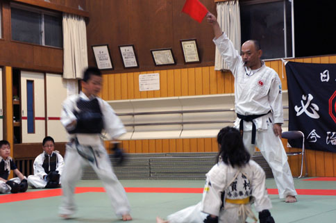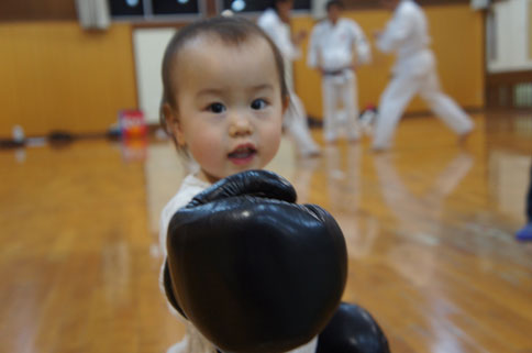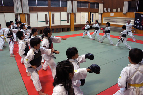 少年部稽古の締めは、小学校二年生のコタロー指導員、四年生のもえこ、五年生のりんか、あいこの四人でカエルの合唱?笑い?の気合いの十本突き。(笑)