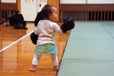 少年部稽古の締めは、「一人で五人分の気合い!」がモットーの小学校二年生のコタロー指導員の気合いの十本突き。