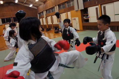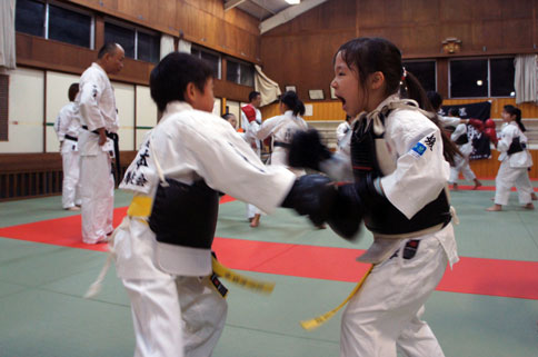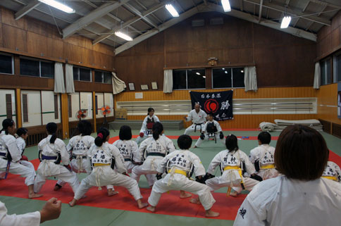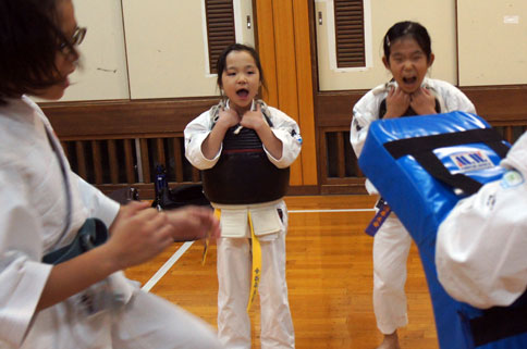 少年部稽古の締めは、小学校六年生の少年部主将のあーちゃんことあかねと「一人で五人分の気合い!」がモットーの小学校二年生のコタロー指導員の号令で気合いの十本突き。