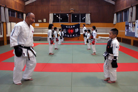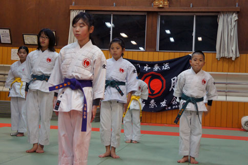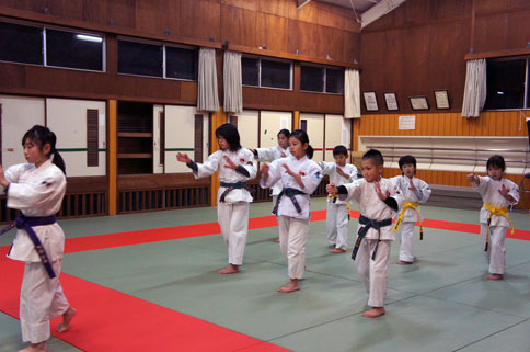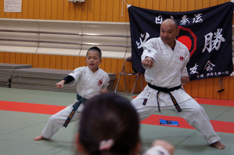 少年部稽古の締めは、「一人で五人分の気合い!」がモットーのコタロー指導員の号令で気合いの十本突き。