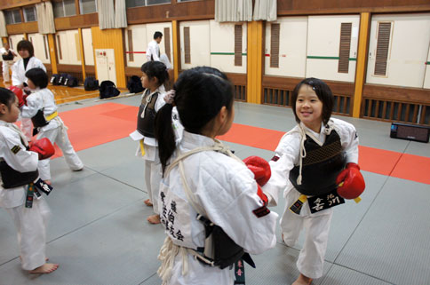 寒いけど、防具練習になると子ども達の顔がいきいき。