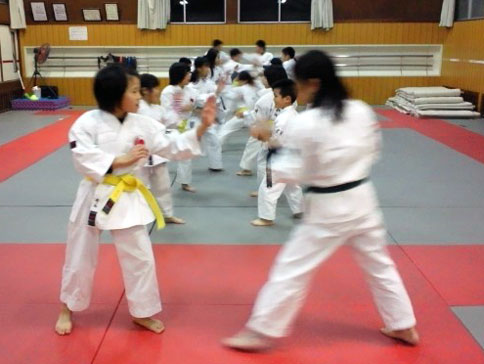 中学二年生の少年部主将かつき、小学校五年生のけいた、かんと、ゆうひのYKKトリオの指導で形を練習中。