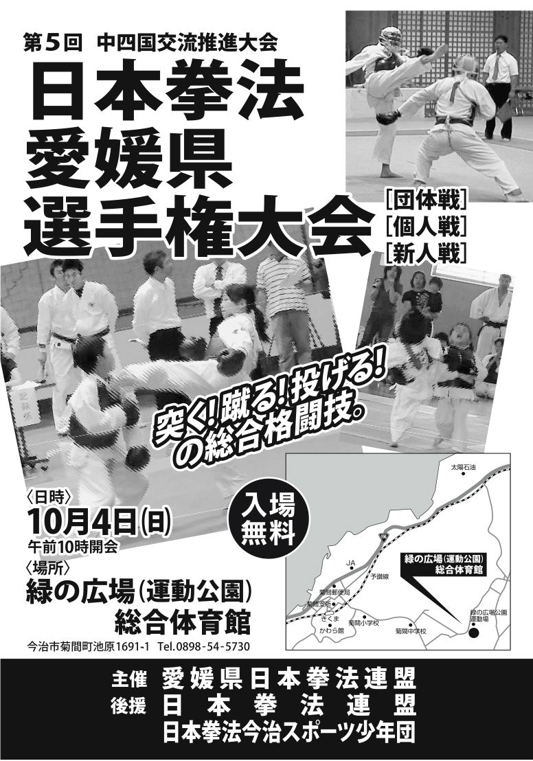 | |愛媛県連盟 (Ehime)|日本拳法 (Kempo)|形 (Kata)|組織 (Org)|道場案内 (Dojo)|活動紹介 (Intro)| |活動報告 (Report)|活動記録 (Record)|募集案内 (Recruit) |関連グッズ (Goods)|(Gallery)| |