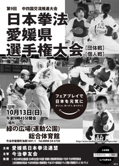 | |愛媛県連盟 (Ehime)|日本拳法 (Kempo)|形 (Kata)|組織 (Org)|道場案内 (Dojo)|活動紹介 (Intro)| |活動報告 (Report)|活動記録 (Record)|募集案内 (Recruit) |関連グッズ (Goods)|(Gallery)| |