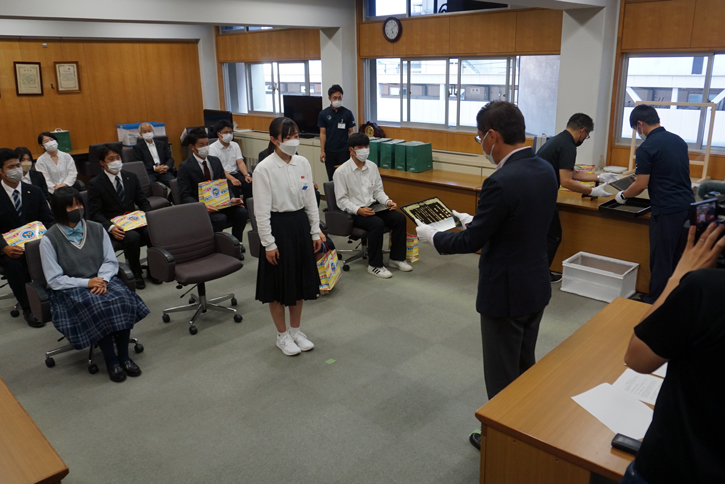 各選手は成績紹介とともに「世界で戦える選手になるため練習を積みたい」「表彰式がゴールではなく、スタート。世界大会出場を見据えている」などと抱負を述べた。徳永繁樹市長は桜井漆器でできた表彰状を各選手に手渡し「さらなる高みを目指して頑張ってほしい」とエールを送った。