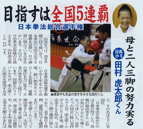 日本拳法総合選手権に小学1年生から出場。鋭い胴突きとスピードを武器に、連覇の重圧も力に変え、王者の座を死守しつづけています。同級生達のライバルたちが、虎太郎くんの弱点を研究するほど、その名は全国区。