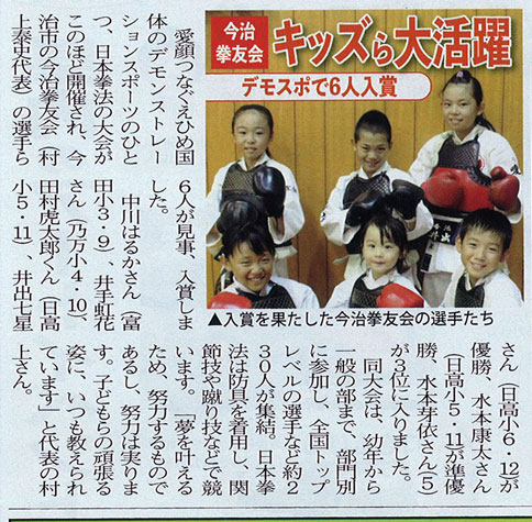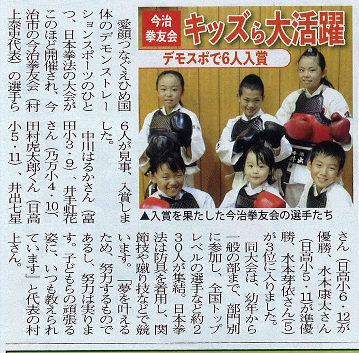 愛顔つなぐえひめ国体のデモンストレーションスポーツのひとつ、日本拳法の大会がこのほど開催され、今治市の今治拳友会(村上泰史代表)の選手ら6人が見事、入賞しました。