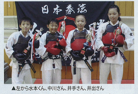 防具を付け、突きや蹴り技で競い合う「2017日本拳法総合選手権大会」が先頃、大阪府で開催され、今治拳友会(村上泰史代表)所属の小学生4人が優秀な成績を収めました。中川はるかさん(富田小3・9)、井手虹花さん(乃万小4・10)が優勝、水本康太くん(日高小5・11)が準優勝、井出七星さん(日高小6・12)が3位に入りました。