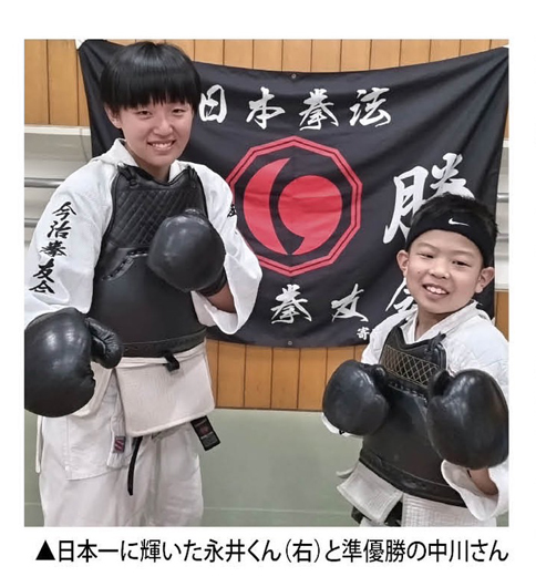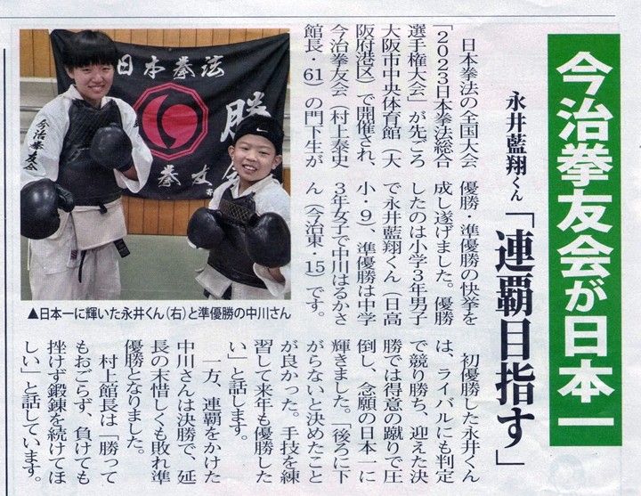少年拳法の春の甲子園と言われる「日本拳法全国少年大会」が先ごろ、大阪で開催され今治拳友会日本拳法今治スポーツ少年団(村上泰史館長)の門下生の一人が優勝、2人が準優勝の輝かしい成績を残しました。また団体戦は中学女子の部でも優勝し、中学生男子の部で準優勝の快挙です。